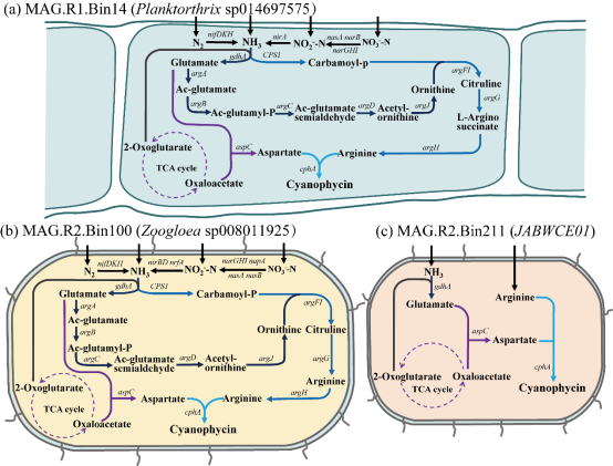 廢水中含有豐富的可回收氮資源。傳統的廢水處理工藝在硝化反硝化過程中產生氧化亞氮溫室氣體。微生物同化回收廢水中氮素可緩解水體富營養化和碳排放。在藻菌共生系統中,藍藻和許多其他細菌可產生富氮聚合物——藻青素。提高藻青素產量不僅有助于廢水中碳、氮的增值轉化,還有助于減少溫室氣體排放。因此,探究藻菌共生系統中藻青素的合成機理有利于實現污水氮資源回收。