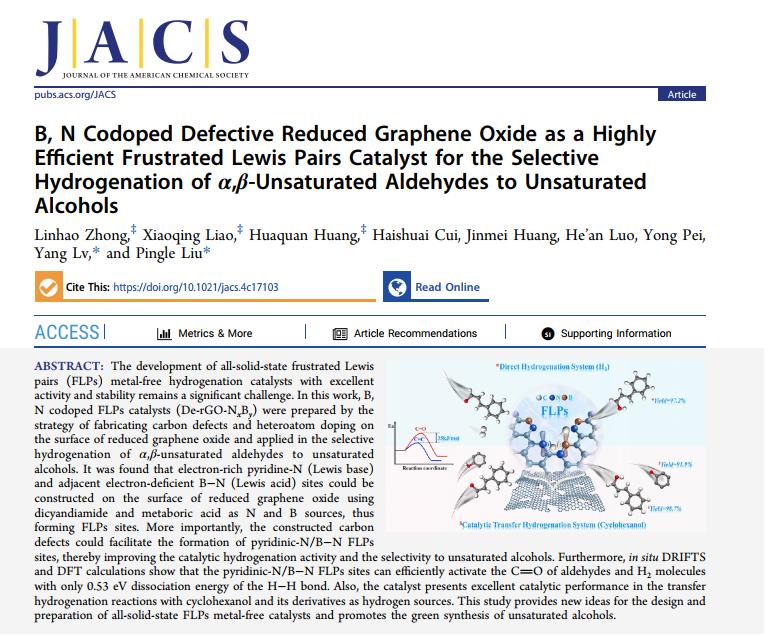 近日,化工學院劉平樂教授與呂揚副教授在碳基全固態(tài)FLPs催化劑構(gòu)筑及催化α,β-不飽和醛選擇性加氫制備不飽和醇的研究工作取得了突出進展。相關(guān)研究成果以《B,N共摻雜缺陷還原氧化石墨烯作為高效受阻路易斯酸堿對催化劑用于α,β-不飽和醛選擇性加氫制備不飽和醇》(B, N Codoped Defective Reduced Graphene Oxide asaHigh-efficient Frustrated Lewis Pairs Catalyst for the Selective Hydrogenation of α,β-Unsaturated Aldehydes to Unsaturated Alcohols)為題,發(fā)表在國際著名學術(shù)期刊《美國化學會志》(Journal of the American Chemical Society)。我校博士研究生鐘琳浩博士、廖小晴博士以及黃華荃博士為論文共同第一作者,劉平樂教授和呂揚副教授為論文共同通訊作者,我校為第一完成單位和唯一通訊單位。該研究工作得到了國家自然科學基金、博士后面上項目以及湖南省自然科學基金等項目的資助。